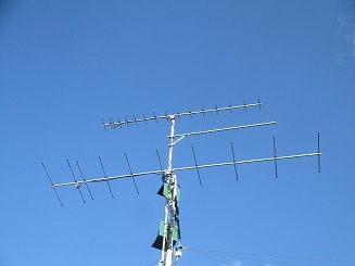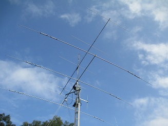 "HF tower" : lower yagi boom 14/18/21/24/28 MHz, upper boom 50 MHz. |