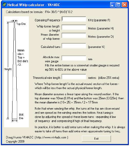 Every so often I find that I need to make up "yet another" HF helical whip antenna - for mobile or portable operation. There aren't too many on-line calculators that will allow you to readily design your own whip to your parameters : frequency, length and effective diameter of the former. I should point out that the calculator software gives you the starting point for creating one - it is not an exact science as all sorts of factors influence the final frequency - how well you have wound it, turns spacing as you get further down the winding.....