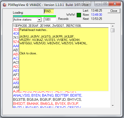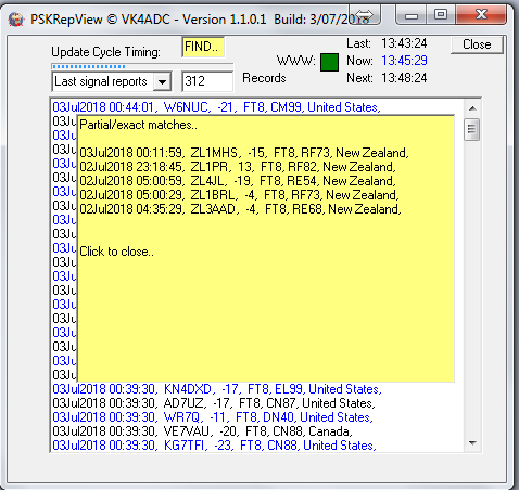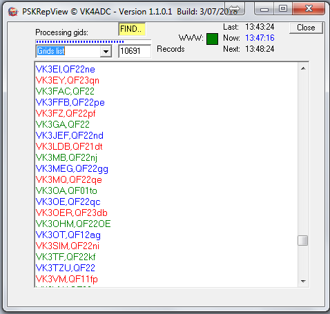 To make reports by a specific station or area - by whole, part or just prefix - easier, a 'Find..' box (light yellow background) allows you to put in a few letters then press Enter to search for matches - and it will work with whichever list is being viewer. Note that it is a WILD search and that the results can be contained anywhere in the displayed list. For example, searching for 'ZL' might show up as W6AZL, VK4ZL, and a list of ZL prefixes. Making it search for 'ZL1' will usually result in only ZL1 prefixes being shown. Similarly, the search can provide a list from the 'Active stations' or 'Grids list' allowing you to display callsigns and grids from a specific area eg 'ZL'. Simply left-click on the search results area to make it disappear.