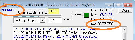 V1.1.0.2 dated 5Jul2018 has some minor changes in place following feedback by the owner of the PSK reporter site. The data retrieved contains a sequence number which is now used to retrieve only 'newer' data from the web server. This is a multi-digit number against a Seq: label under the Next label and changes after each retrieve.