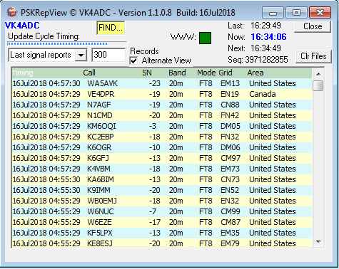 V1.1.0.8 dated 16 & 17Jul2018 has a number of changes internally and some slight repositioning of screen items. The major internal changes were an update of the reports sorting (PSKRpts.txt contents) and a data check to eliminate duplicates as well as enforcing a report count limit of the last 300 items. Improved bug-checking is now in place for very low numbers of reports as well as the high end (300). A new 'Clr Files' button has been added to allow the user to delete the PSKRep.txt and PSKRpts.txt files so the software will do a full re-poll of the PSKReporter web site data at the next scheduled update.